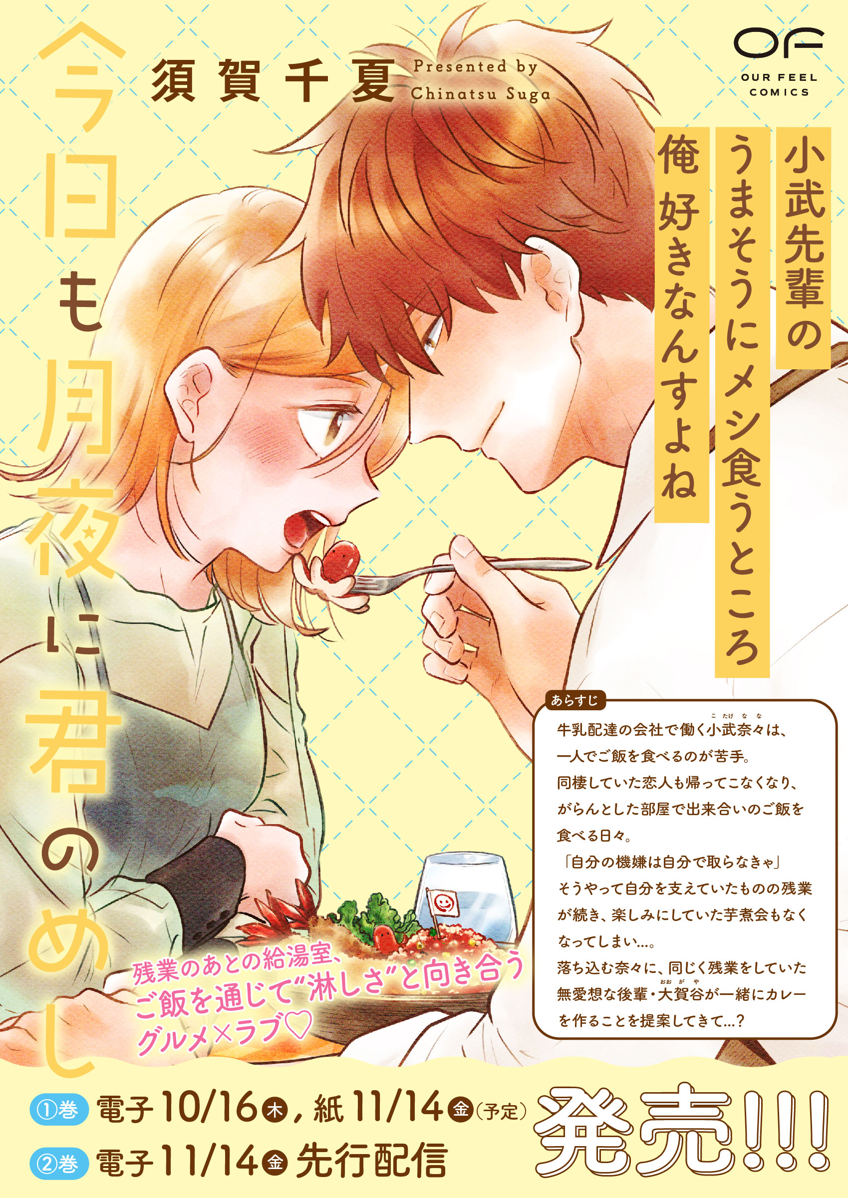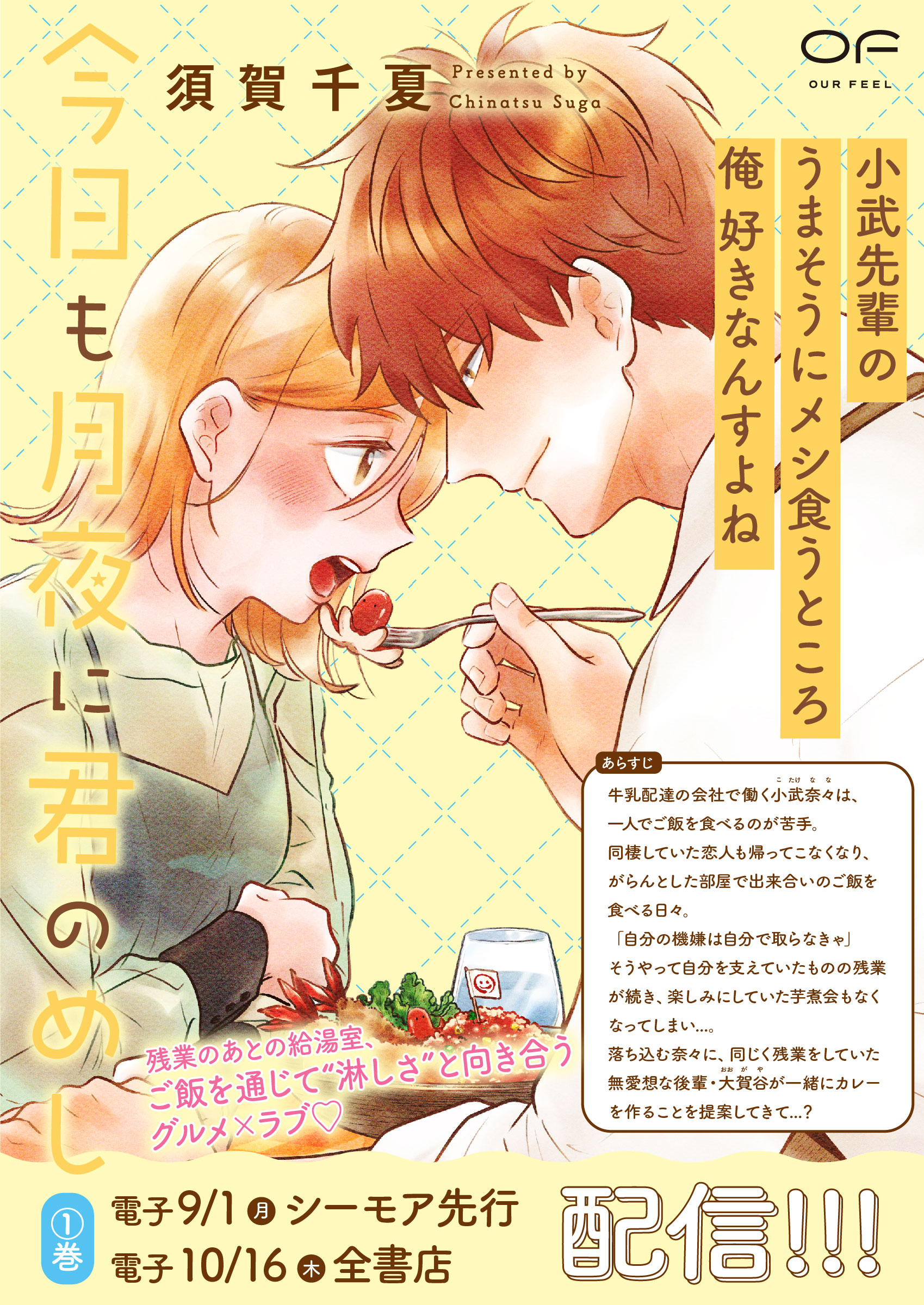 【毎月第1木曜更新!最新2話無料!!】牛乳配達会社で働く小武奈々は、1人でご飯を食べることが苦手。なのに同棲している恋人はだんだん家に帰ってこなくなり、がらんとした部屋で出来合いのご飯を食べる日々。残業も続くそんな中、疲れが滲む小武を見かね同じく残っていたちょっぴり堅物な後輩・大賀谷が一緒にご飯を作らないかと提案してきて…!? 何を食べるか、誰と食べるか。ご飯を通じて“淋しさ”と向き合うグルメ×ラブ!